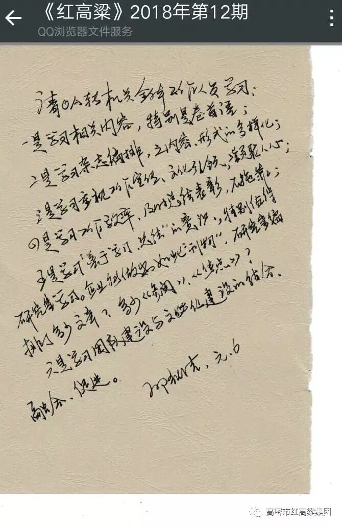 ▲市政府党组成员、办公室主任邱纯洁对集团刊《红高粱》批示